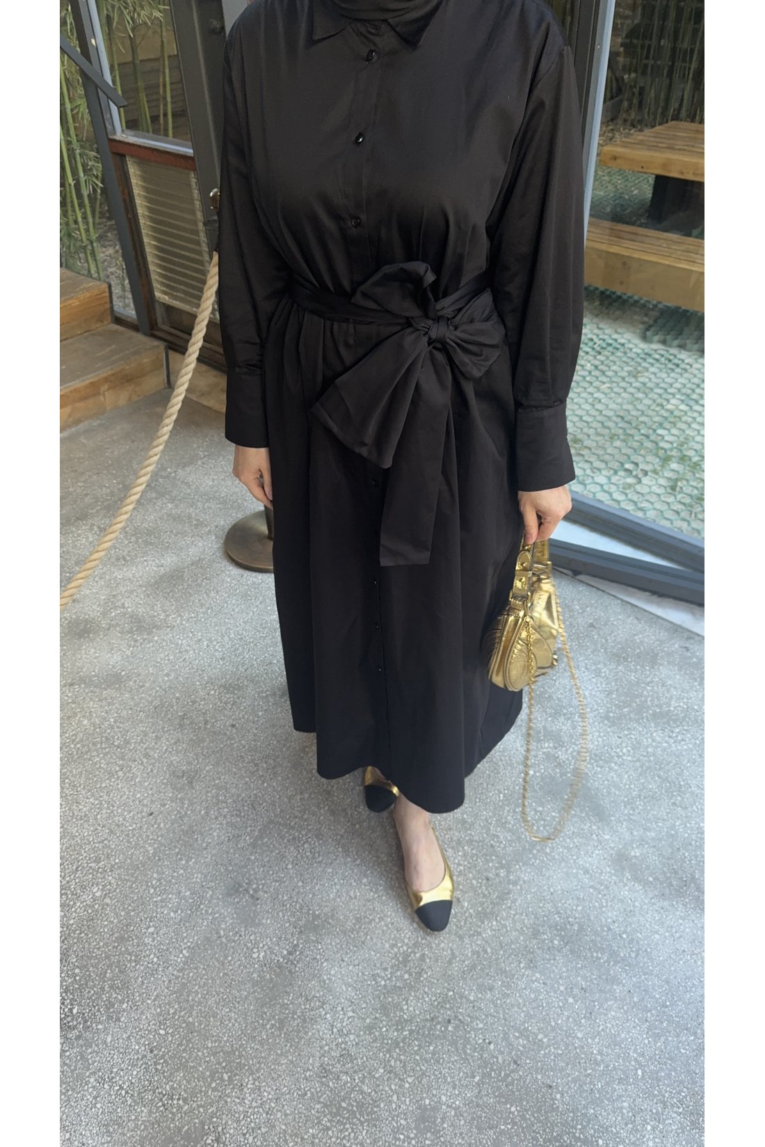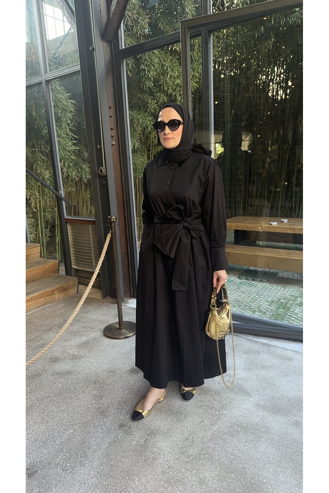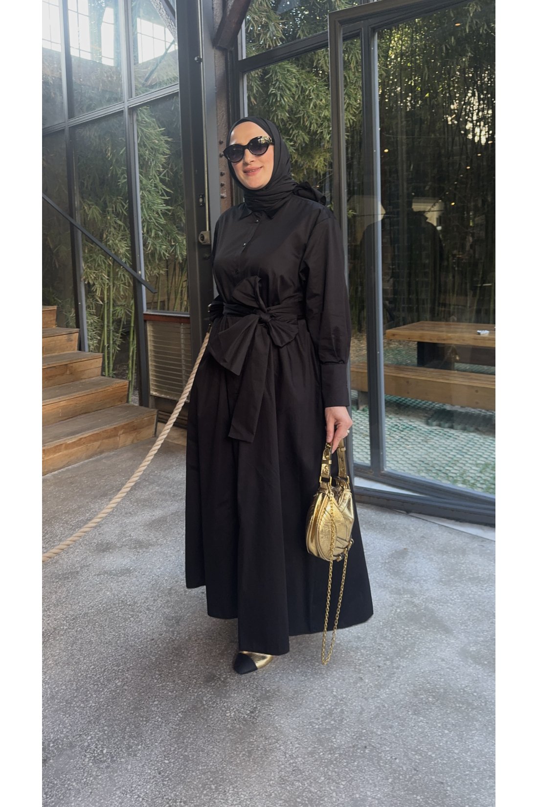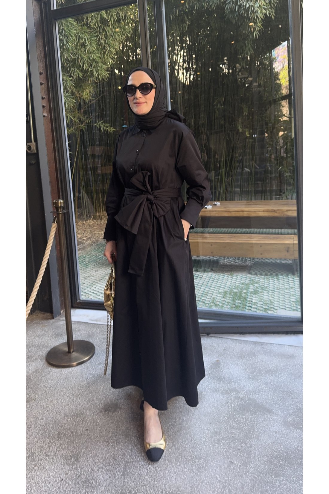 bel kısmındaki geniş kuşak vücut hatlarınızı vurgularken şıklığınıza sofistike bir dokunuş katıyor.